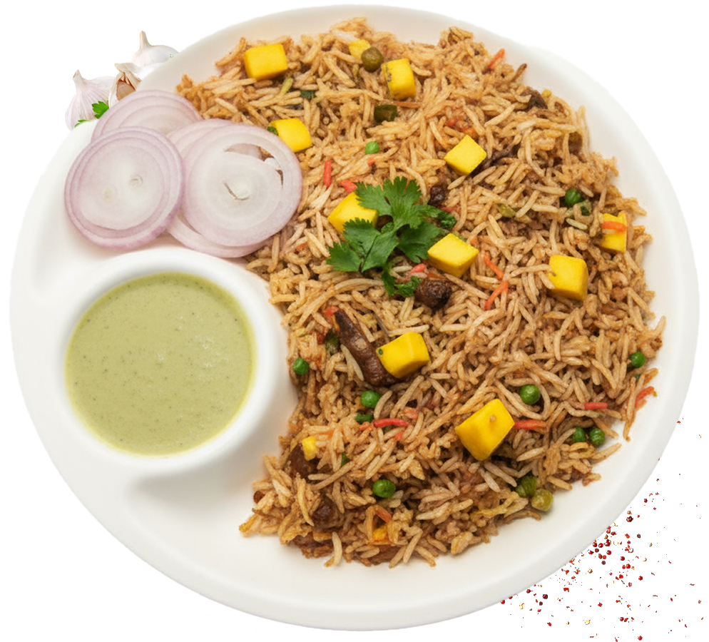 Aromatic dum biryani loaded with paneer, peas, and soya chunks, comfort food that feels like a celebration.