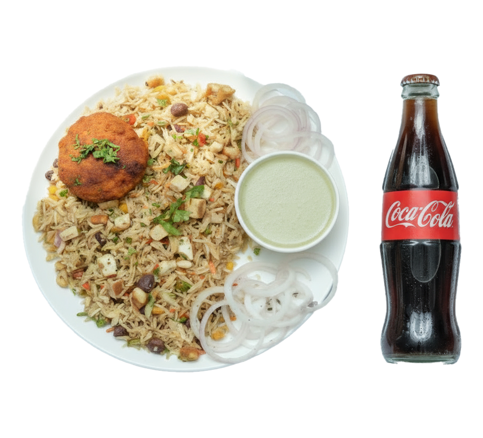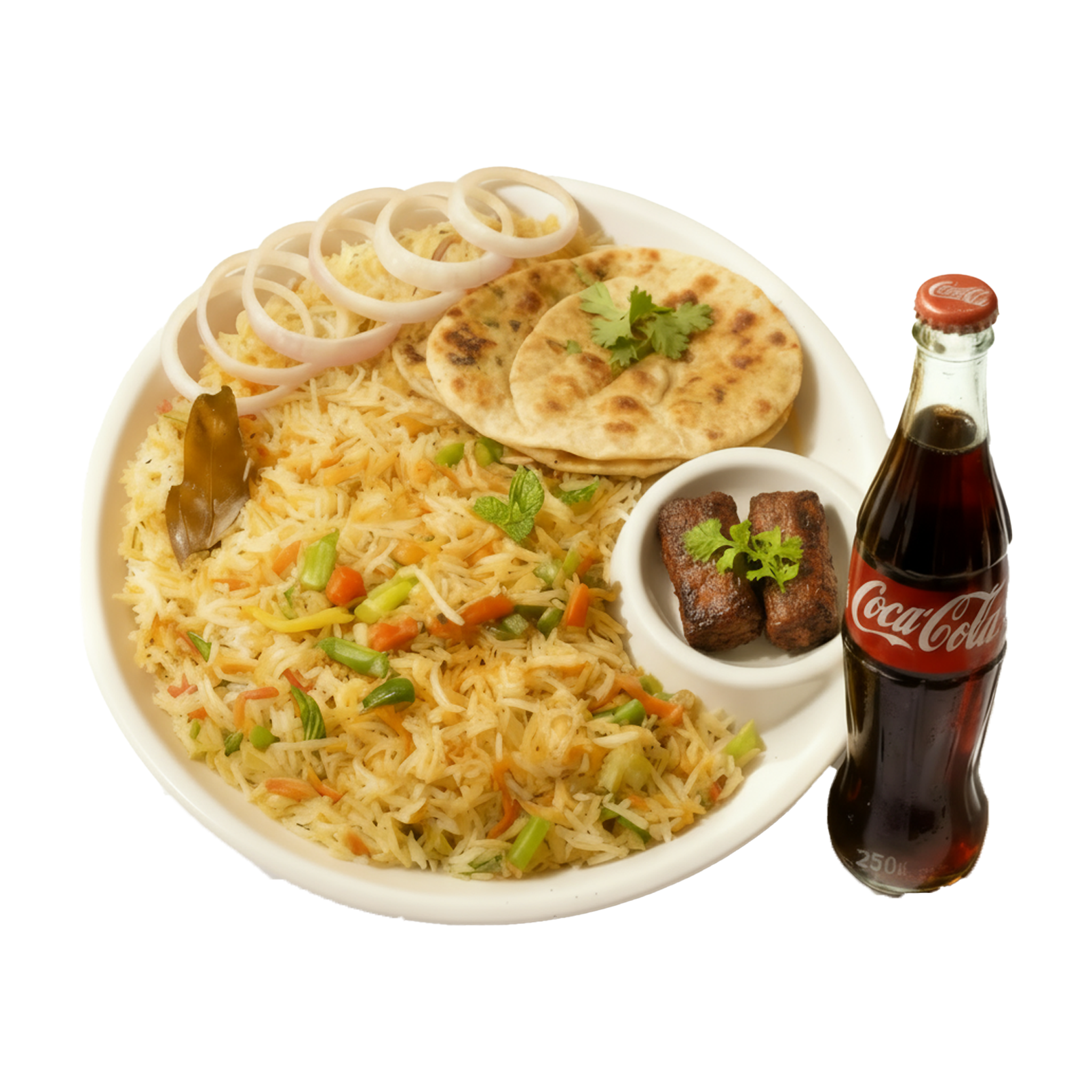 A wholesome veg delight, fragrant biryani, crisp kebab, and a chilled Coke to complete your meal.